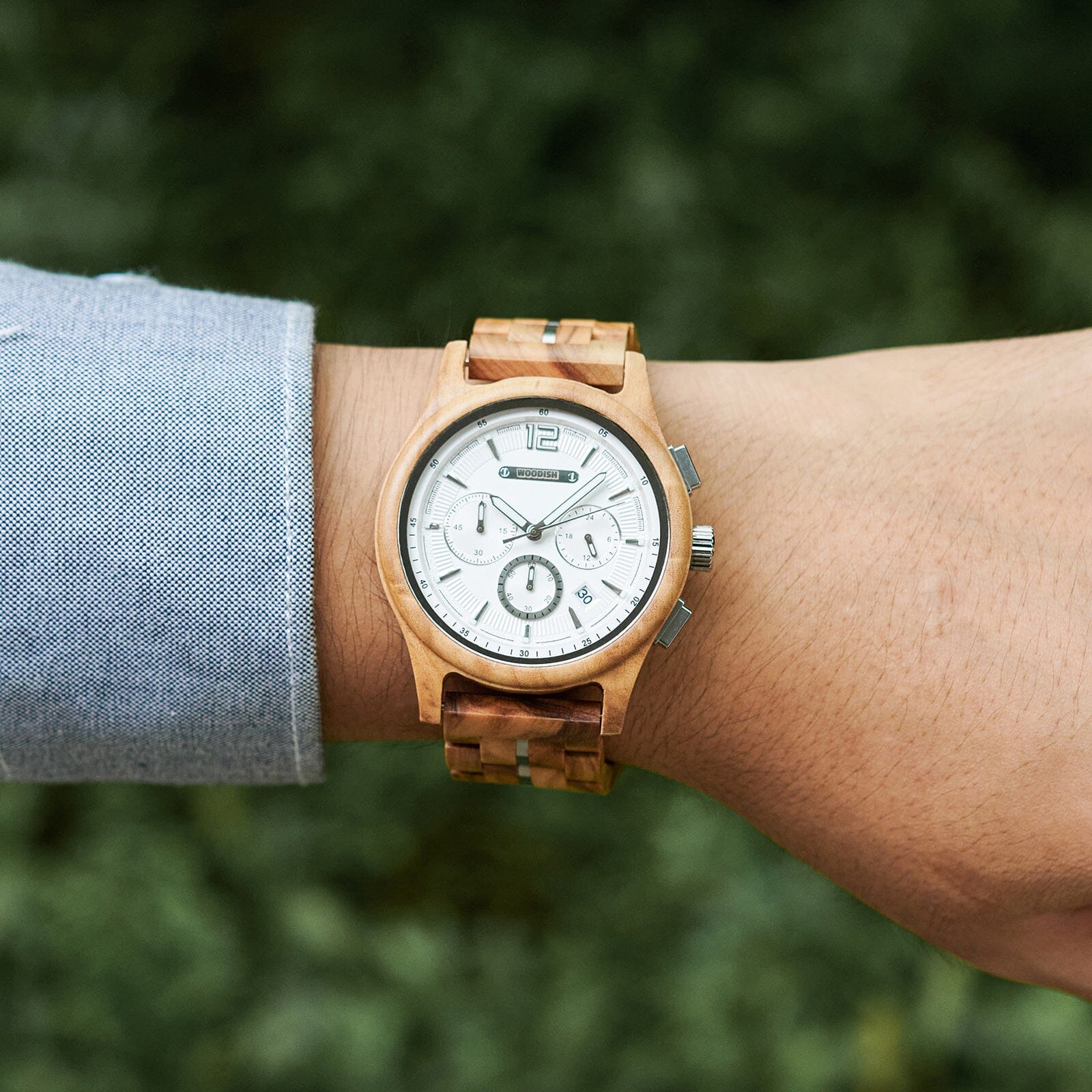 Refined craftsmanship meets natural elegance with the Classic Olive Chronograph Wooden Watch. Handcrafted from premium olive wood, this timepiece blends lightweight comfort with timeless style. The silver chronograph dial adds a touch of sophistication, featuring multiple functional subdials and date display for everyday practicality. Its smooth wooden strap ensures a perfect fit, making it ideal for both casual wear and special occasions.